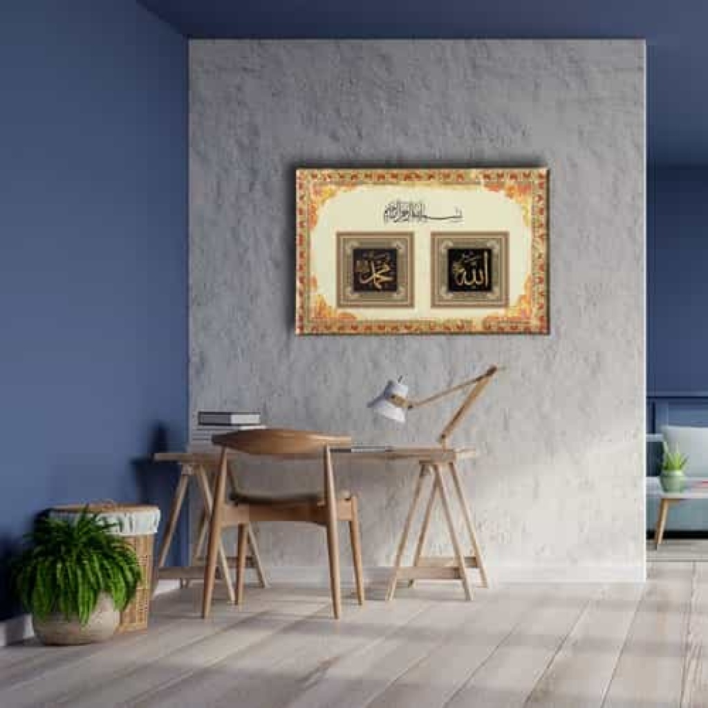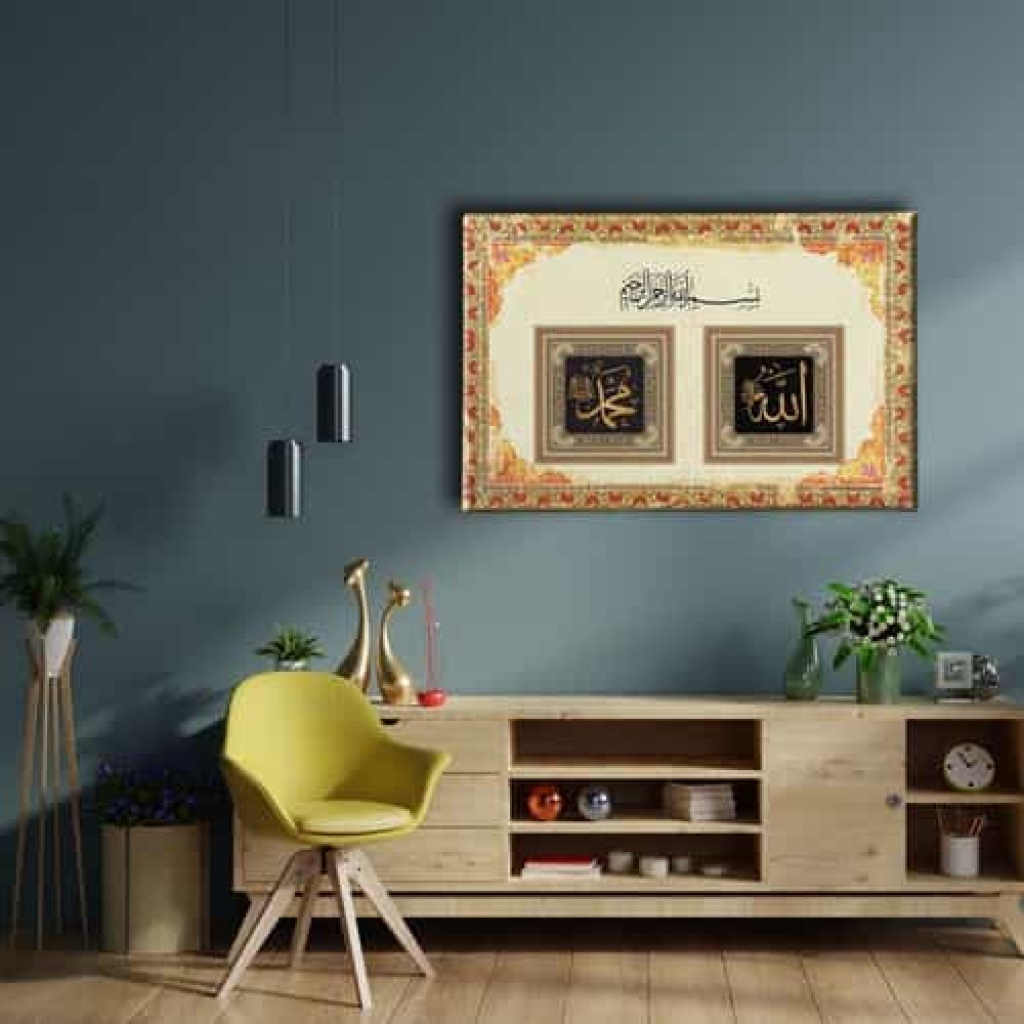 Allah - Muhammed - Besmeleli Tezhipli Dini Kanvas Tablo